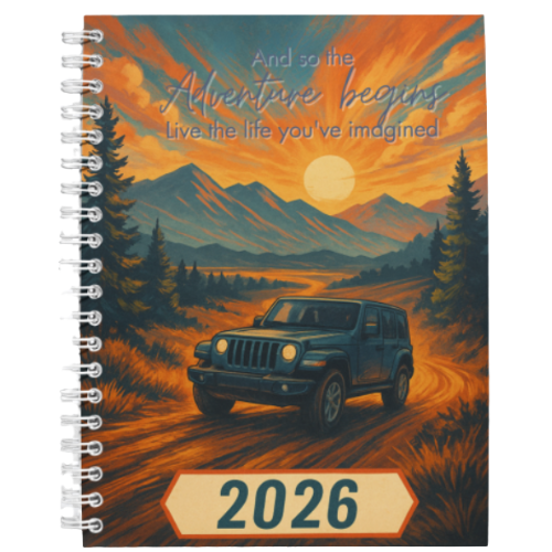 Just as the Jeep carves its path through uncharted terrain, the “Retro” planner becomes your compass, illuminating the way toward unimagined dreams and aspirations. Each sunset holds the promise of discovery, encouraging you to chase your ambitions and embrace the infinite possibilities that await. As the sunset lights up the sky, let “Retro” light up your life, guiding you with the unwavering glow of hope and destiny.